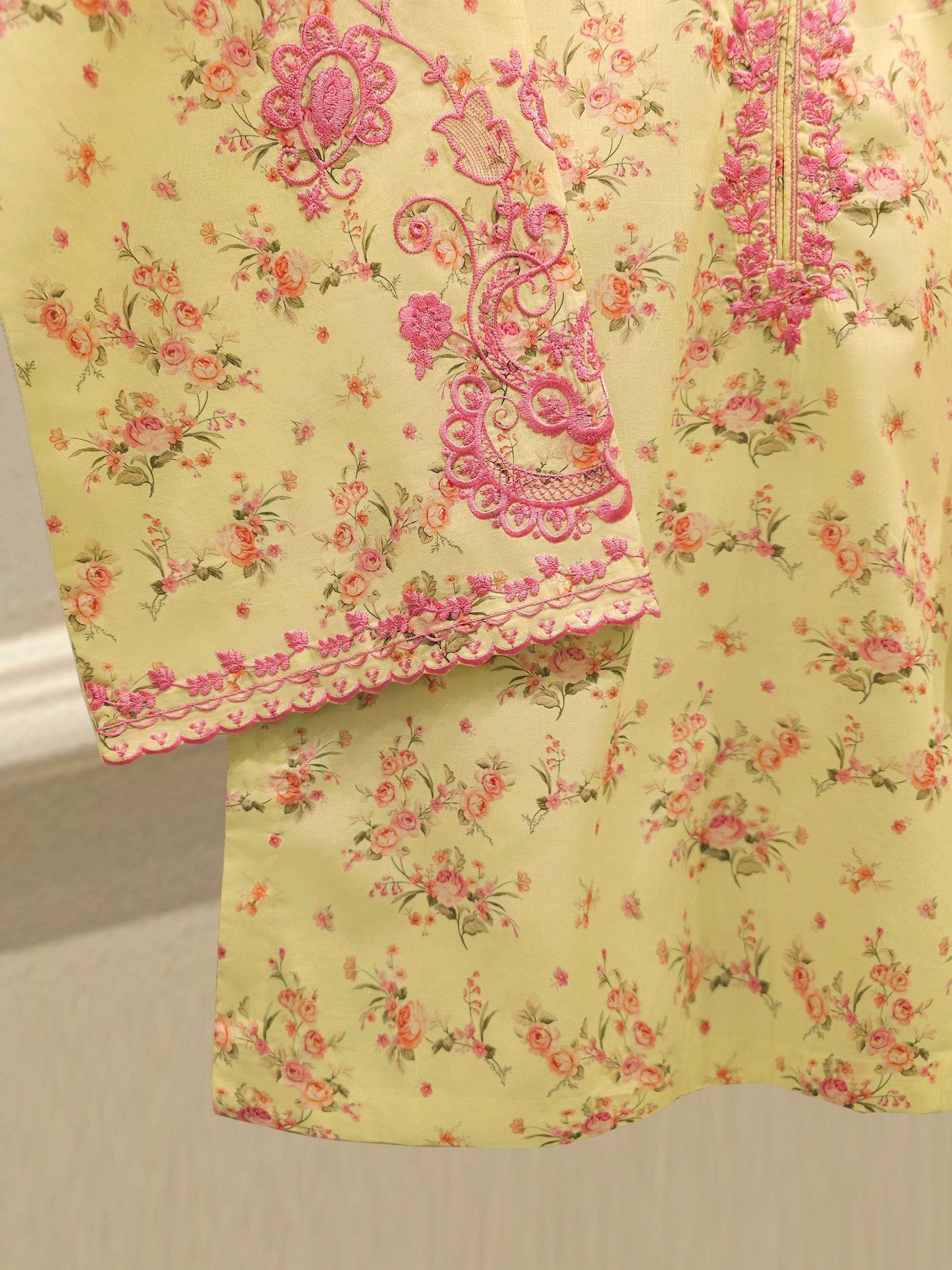 Elevate your summer wardrobe with this beautifully crafted yellow cambric shirt, featuring intricate Chikan Kari work on the sleeves and daman. Designed for timeless elegance, this piece blends breathable lawn fabric with traditional craftsmanship, perfect for festive occasions or casual sophistication.