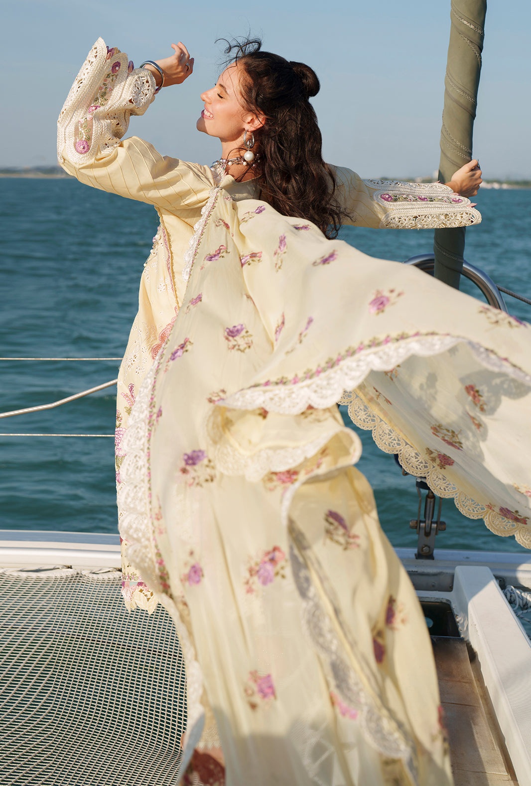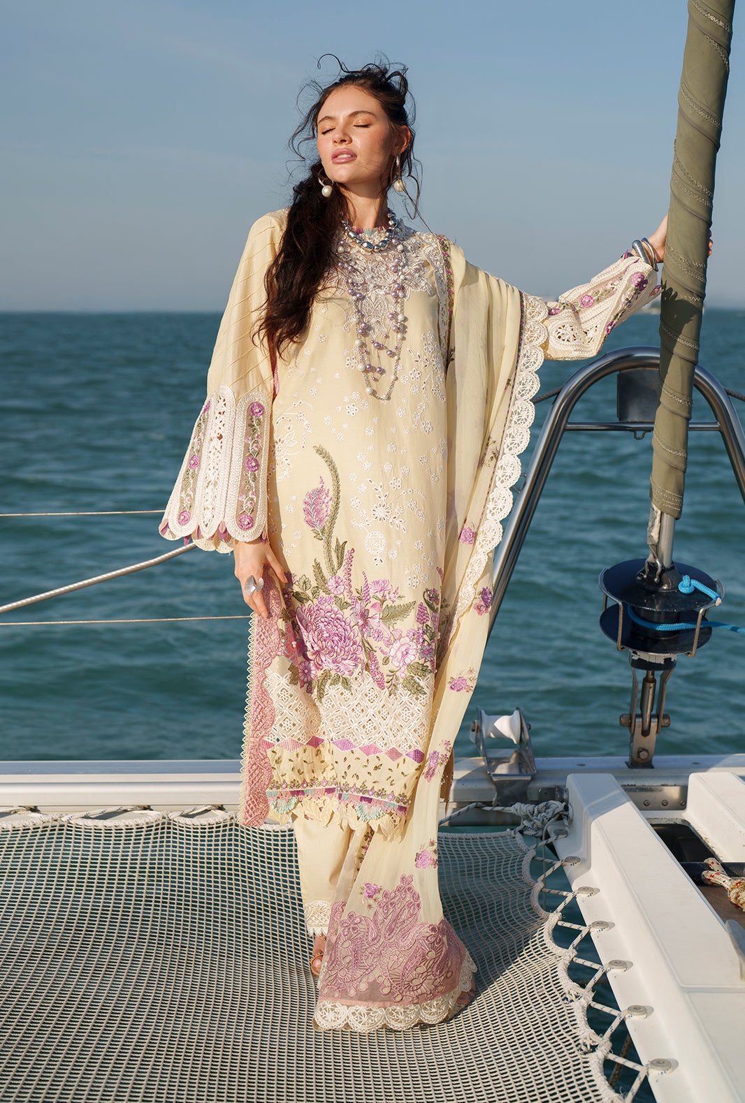 Paired with an intricately embroidered chiffon dupatta and cambric trousers finished with organza, this look exudes timeless elegance and grace.