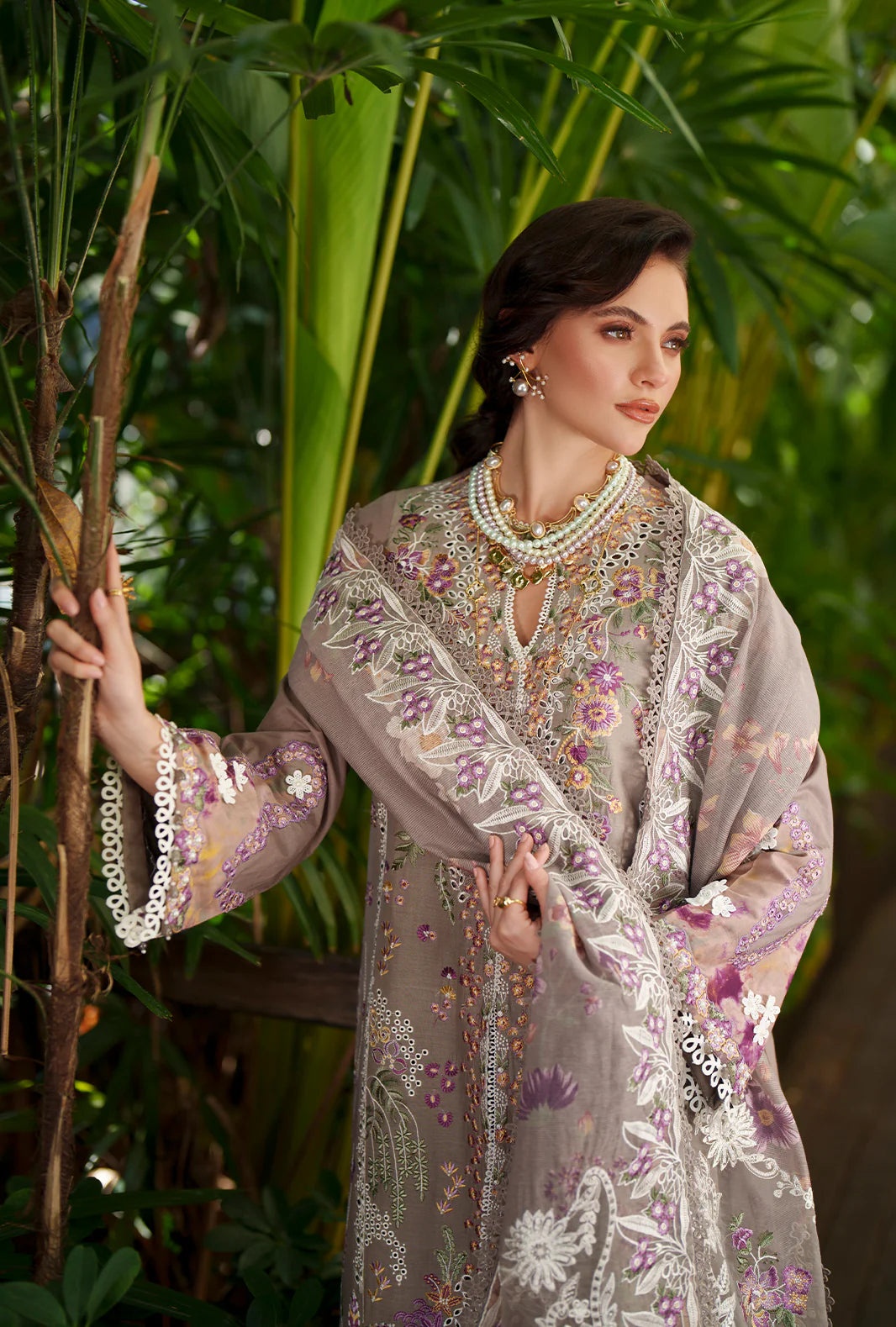 Paired with a printed cotton karandi dupatta and dyed cambric trousers, this ensemble offers a graceful and effortlessly sophisticated finish.