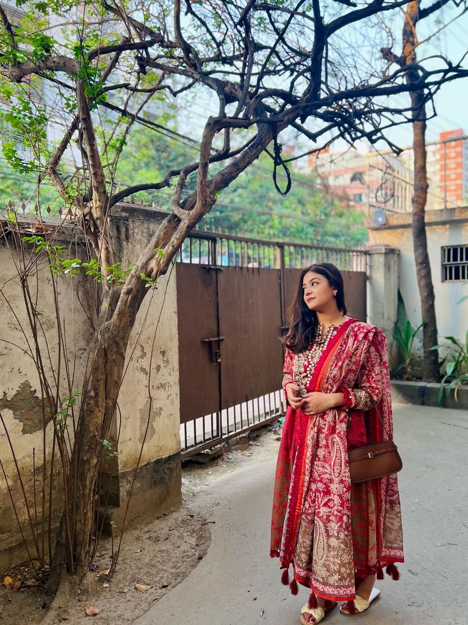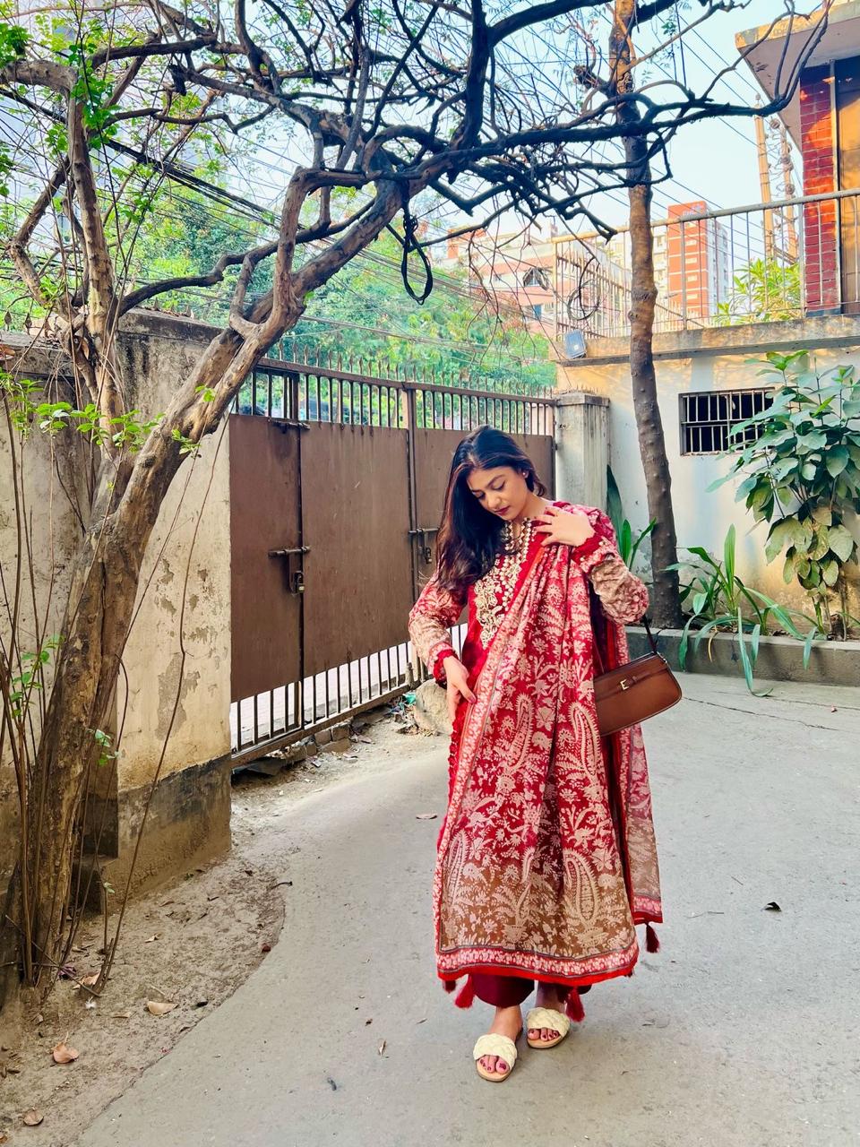 FEX-331 This elegant dress features a deep maroon base highlighted with graceful floral vine motifs in a warm coral-orange shade. The repeating pattern adds a classic, artistic touch, making it perfect for casual wear or refined everyday styling with a traditional feel.