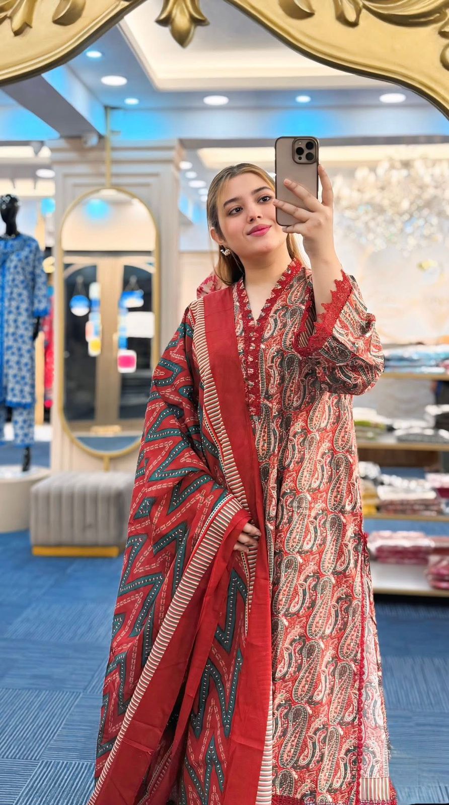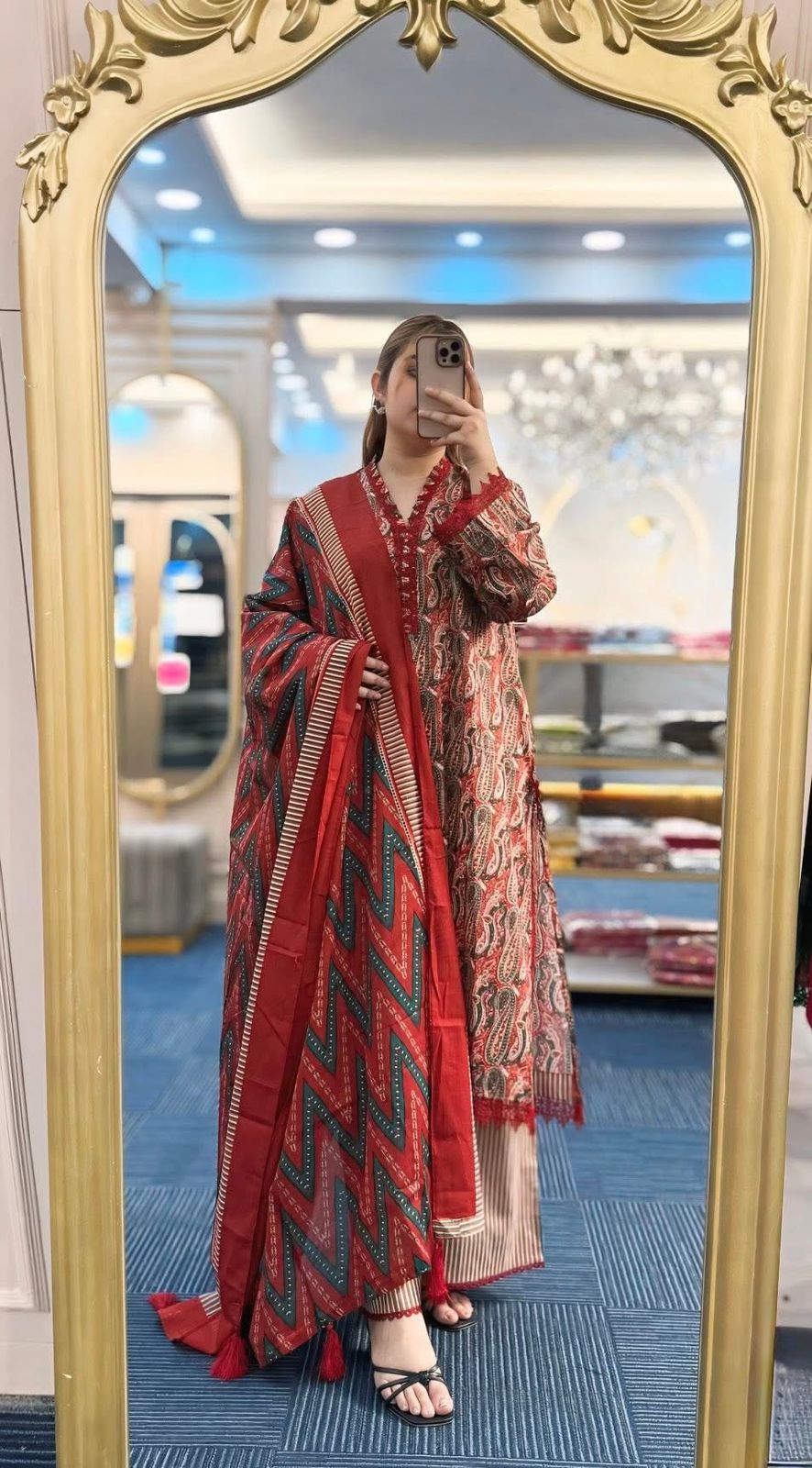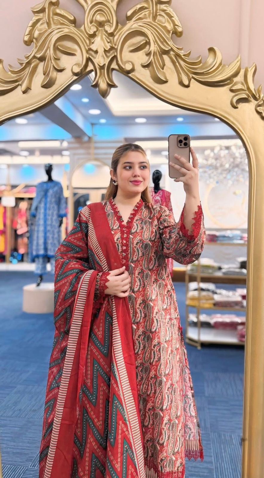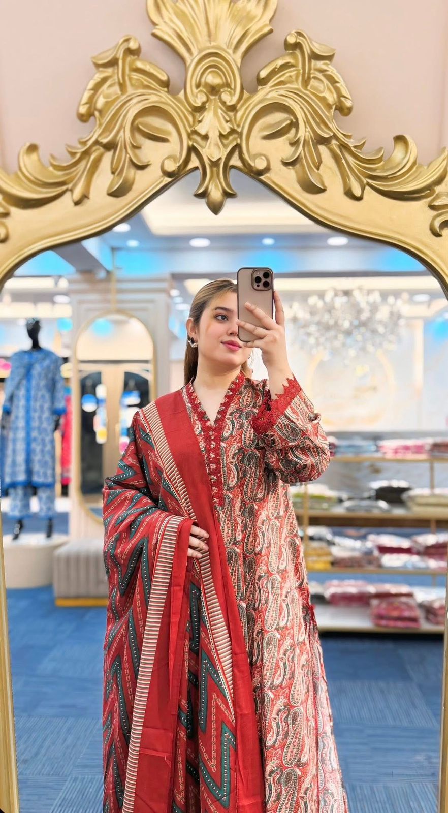 FEX-372 This dress features a rich rust-red base enhanced with an all-over classic paisley print. The intricate motifs are beautifully detailed in shades of teal green, off-white, and subtle peach tones, creating a vibrant yet elegant look. The flowing paisley patterns give the fabric a traditional charm with a modern color balance.