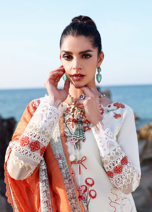 An ode to quiet elegance, this ensemble is created for those who find beauty in refined, tonal hues. Set against a soft ivory canvas, every detail is thoughtfully composed to captivate. Delicate Moroccan-inspired florals bloom gracefully across the fabric, intricately embroidered in harmonious shades of tangerine, sage, and ivory. Subtle schiffli shadowing lends depth and dimension, creating the illusion of hand-sketched artistry brought to life in thread.
