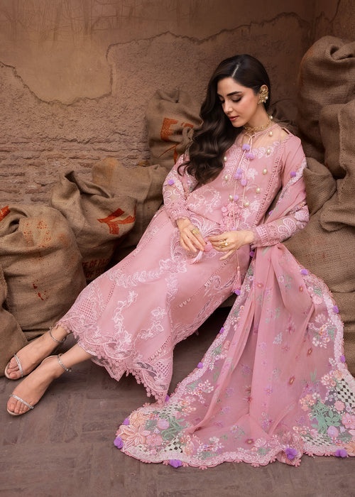 Ophelia, captivates in a luscious deep blush hue an arresting shade that commands attention and lingers in memory. The ensemble comes to life through exquisite floral laser work and delicate organza appliqué embroidery, where rich tones of blush pinks and soft ivory intertwine within graceful, swirling botanical patterns. The laser-cut appliqué neckline, adorned with leafy vine motifs, lends a refined femininity and intricate charm. A beautifully printed floral chiffon dupatta completes the look, framed with a pink scalloped border that drapes like a gentle whisper across the shoulders. Finished with elegant cutwork detailing on all four corners, it envelops the wearer in an aura of effortless sophistication and timeless grace.
