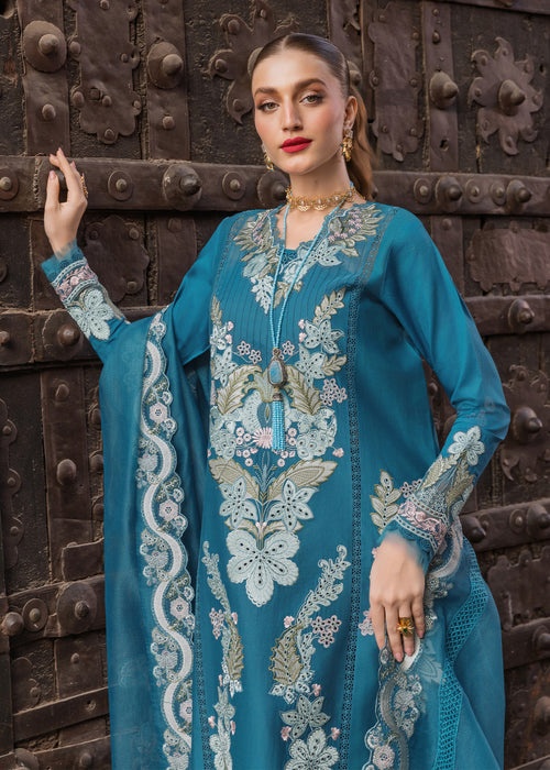 The Turquoise Enchantment unfolds like a dream suspended between dusk and moonlight, immersed in a deep turquoise hue that echoes twilight skies and shimmering waters. The fabric comes alive with intricate ghara floral embroidery in layered tones of blue and olive—each motif exquisitely rendered and elevated with delicate schiffli cutwork that lends texture and depth.