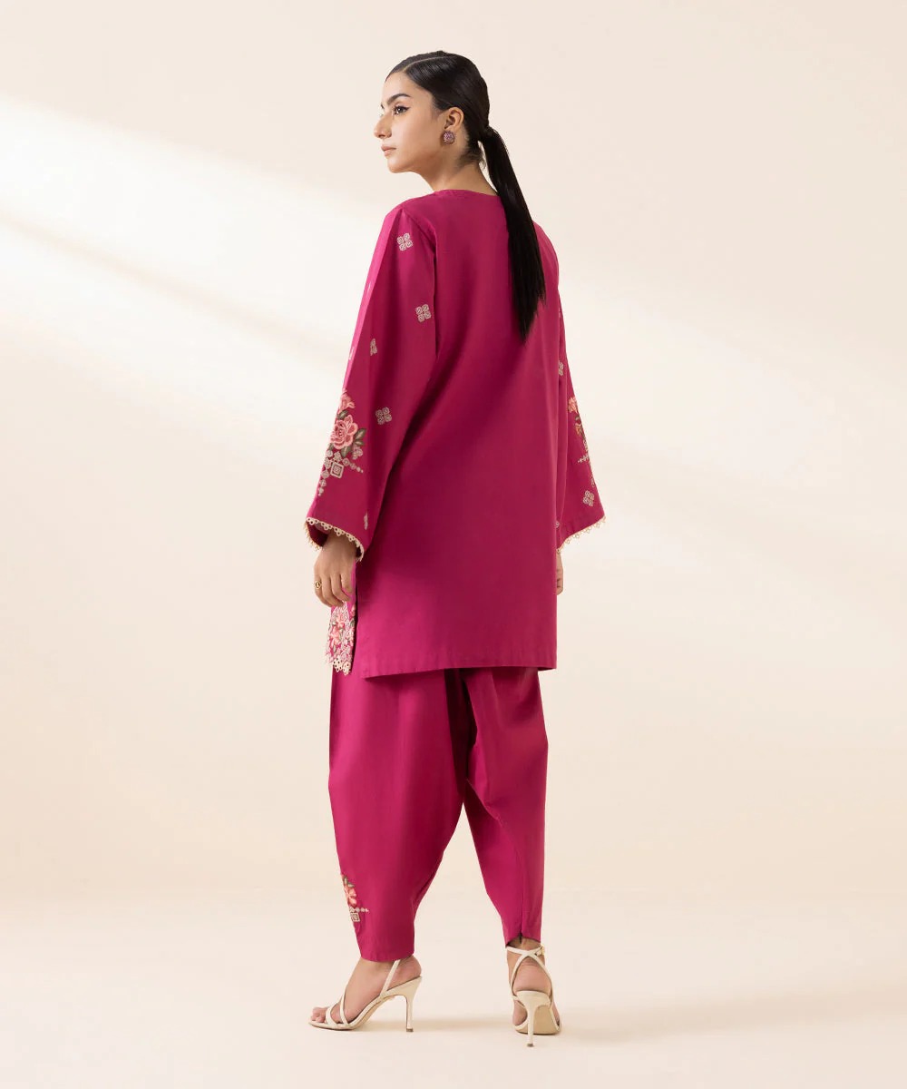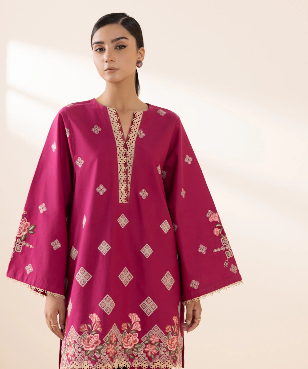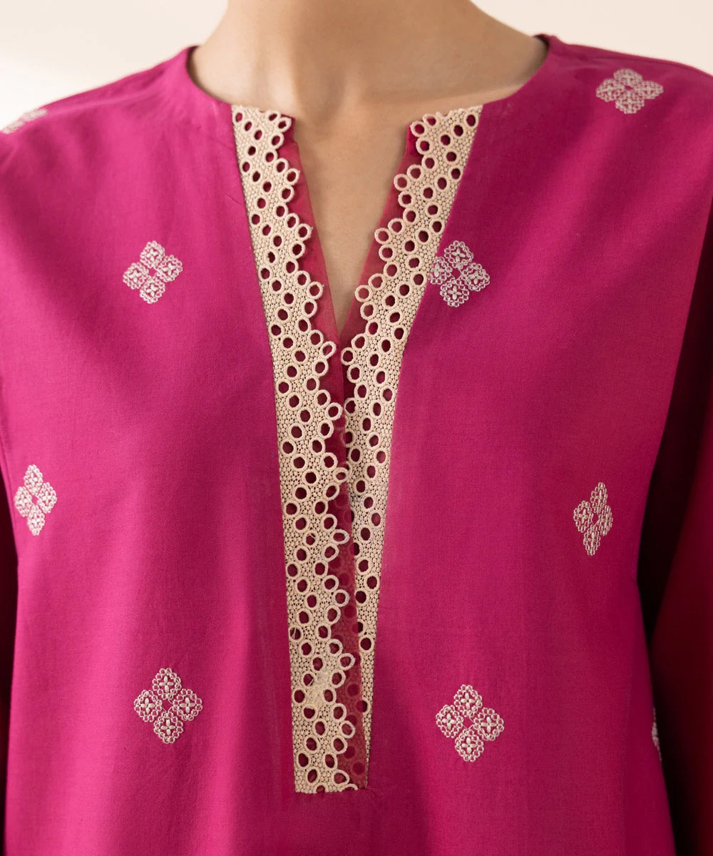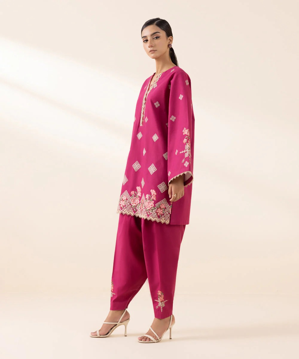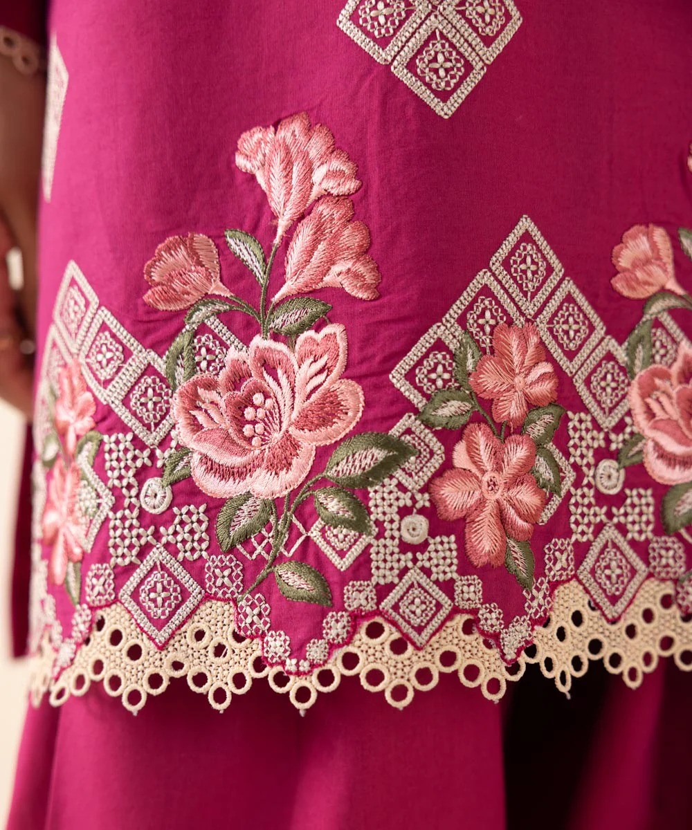 Experience Blooming Florals in Our Crimson. Embroidered Cambric Two-piece Featuring Shirt and Trousers.