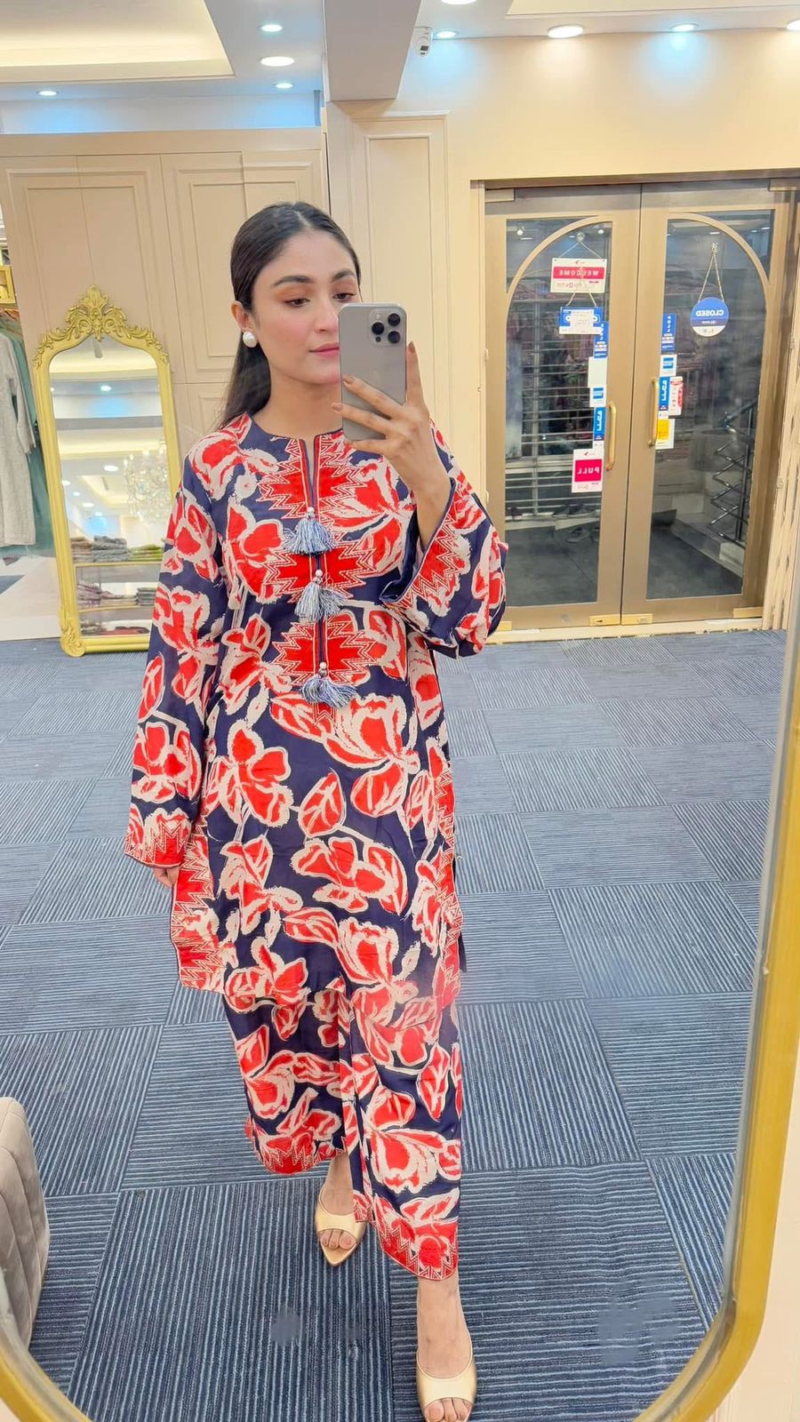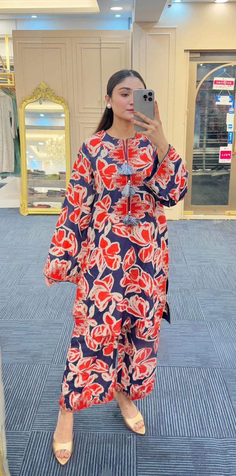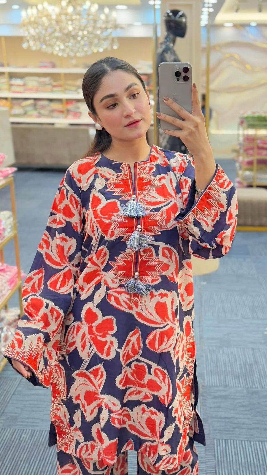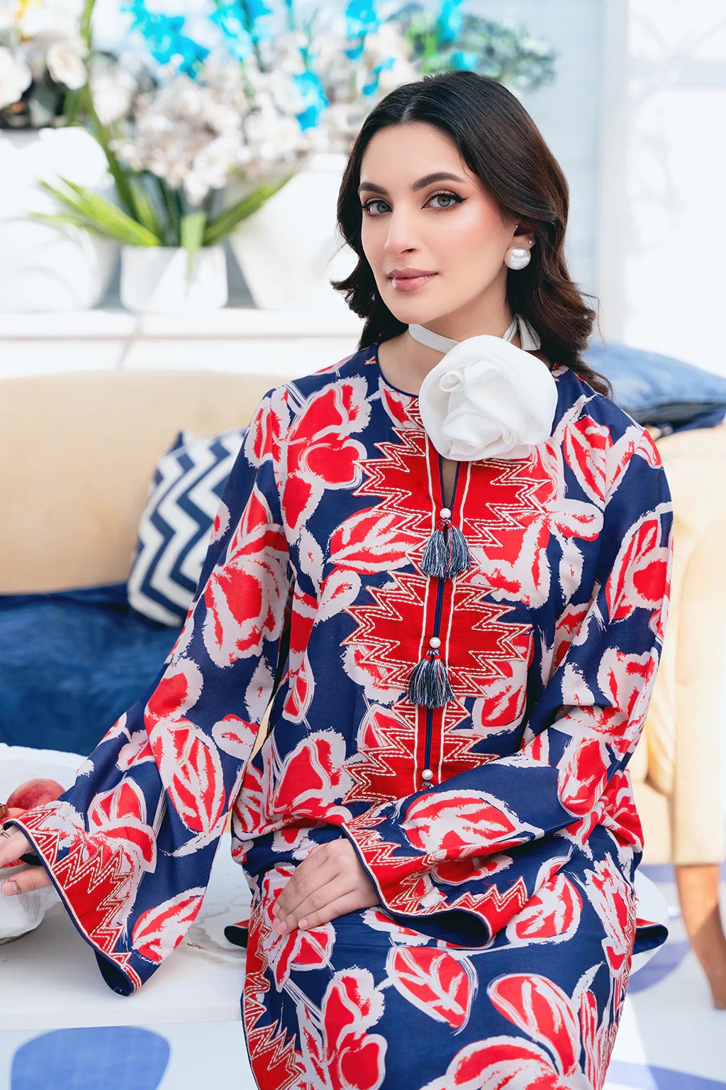 Royal blue and vermillion coloured bold pattern, straight medium length shirt with culottes. Furthermore tribal embroidered patchwork details have been added.