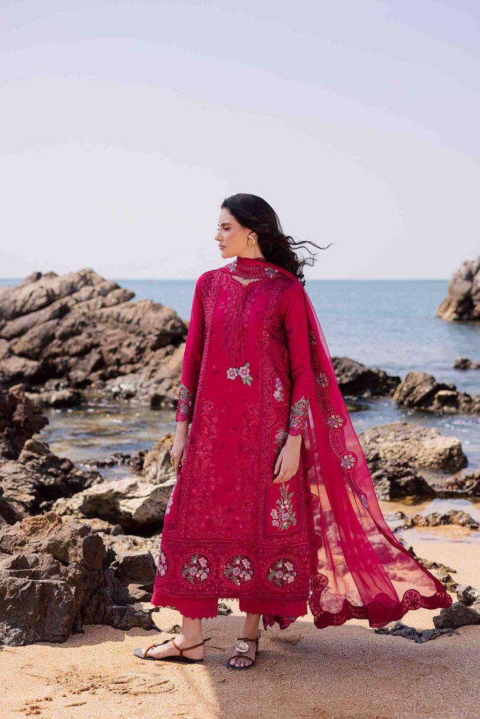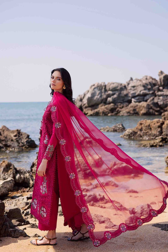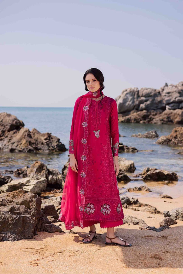 Deep berry pink shirt with multicolored motifs running along the side panels and hem border in soft shades of lavender, green, and pink. Multicolor floral dori tassels add a whimsical charm to the neckline. The long, flowing silhouette is paired with lace edged pants and a berry pink chiffon dupatta finished with scalloped embroidered borders.
