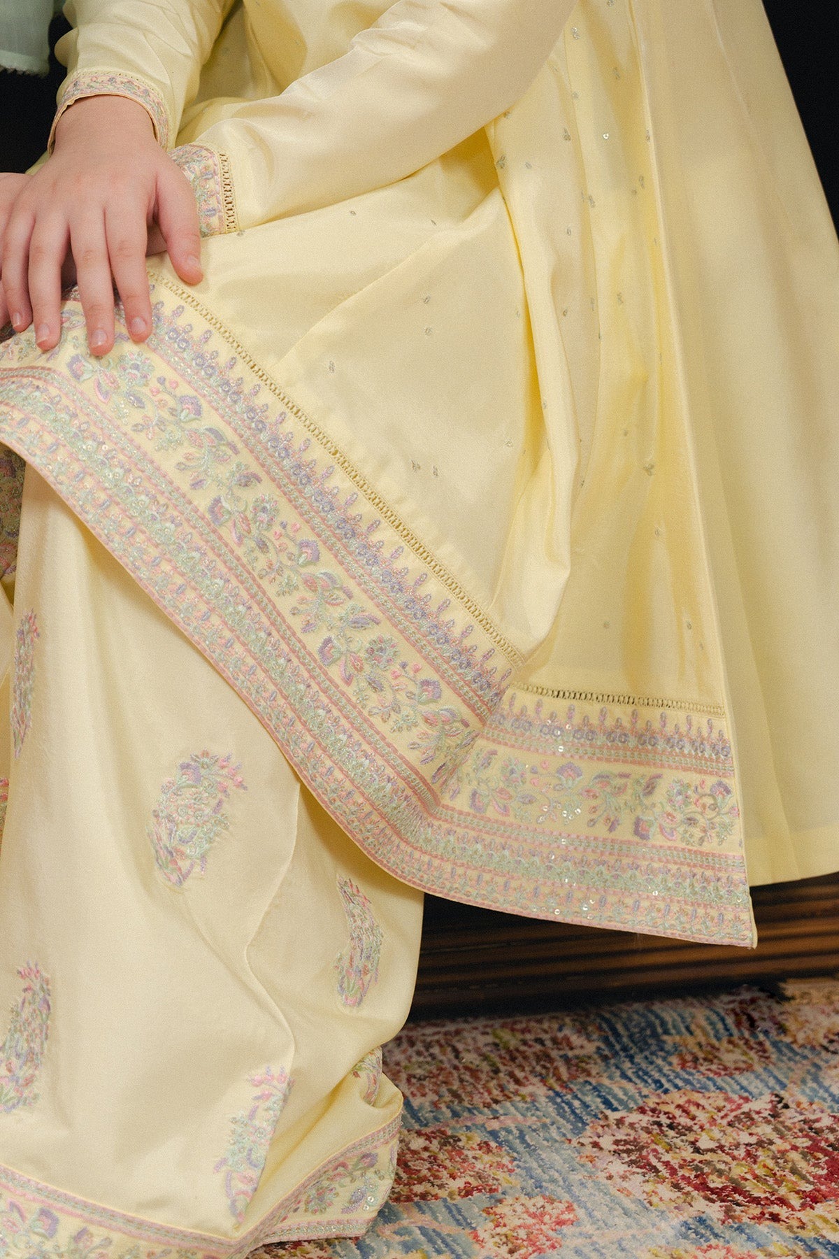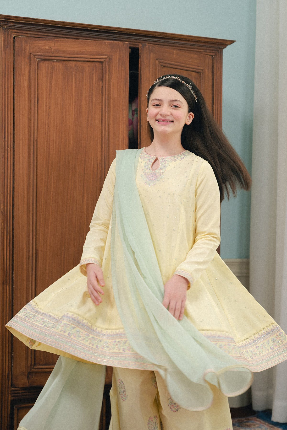 Three-piece set featuring a tilla and resham embroidered shirt, paired with an embroidered shalwar and a chiffon dupatta.